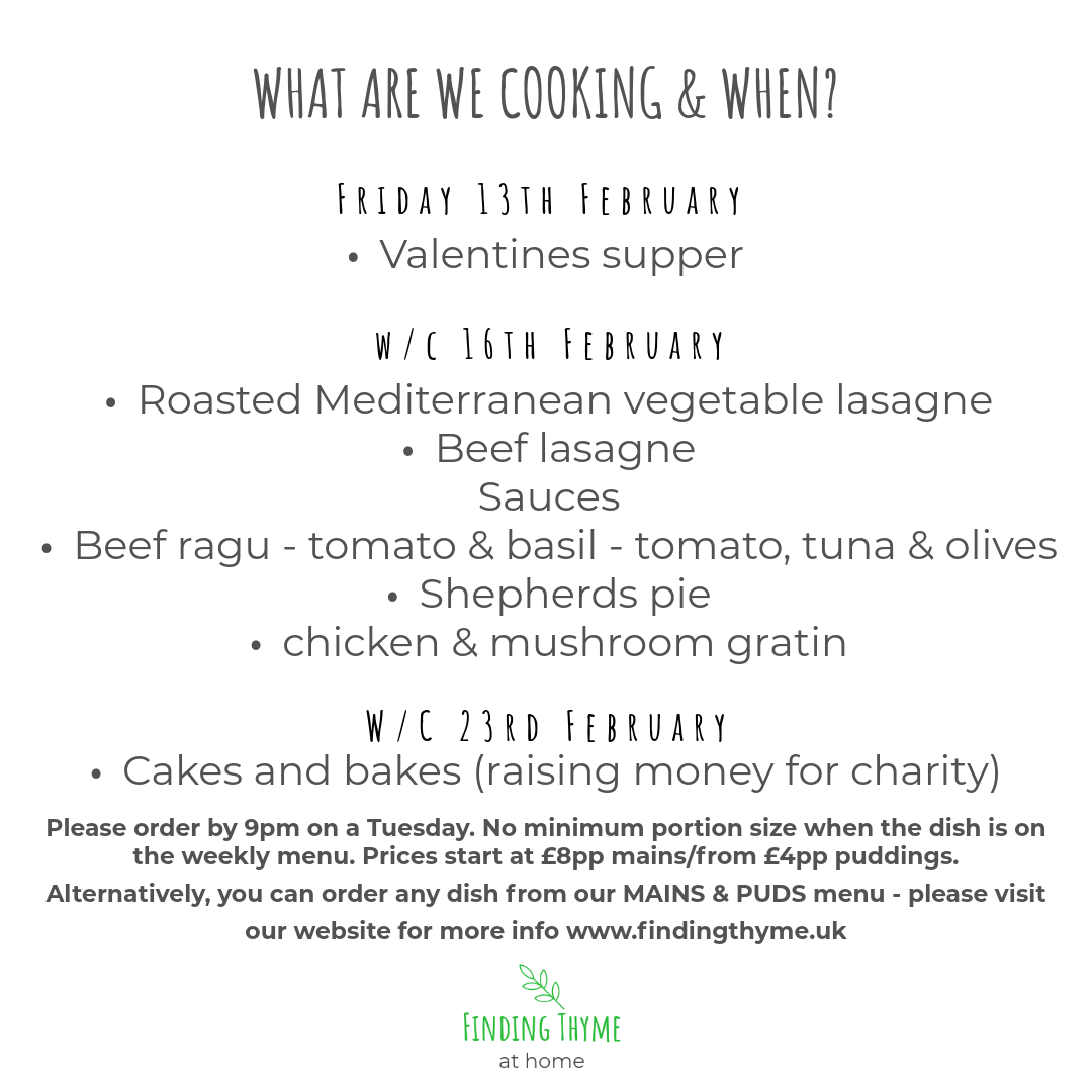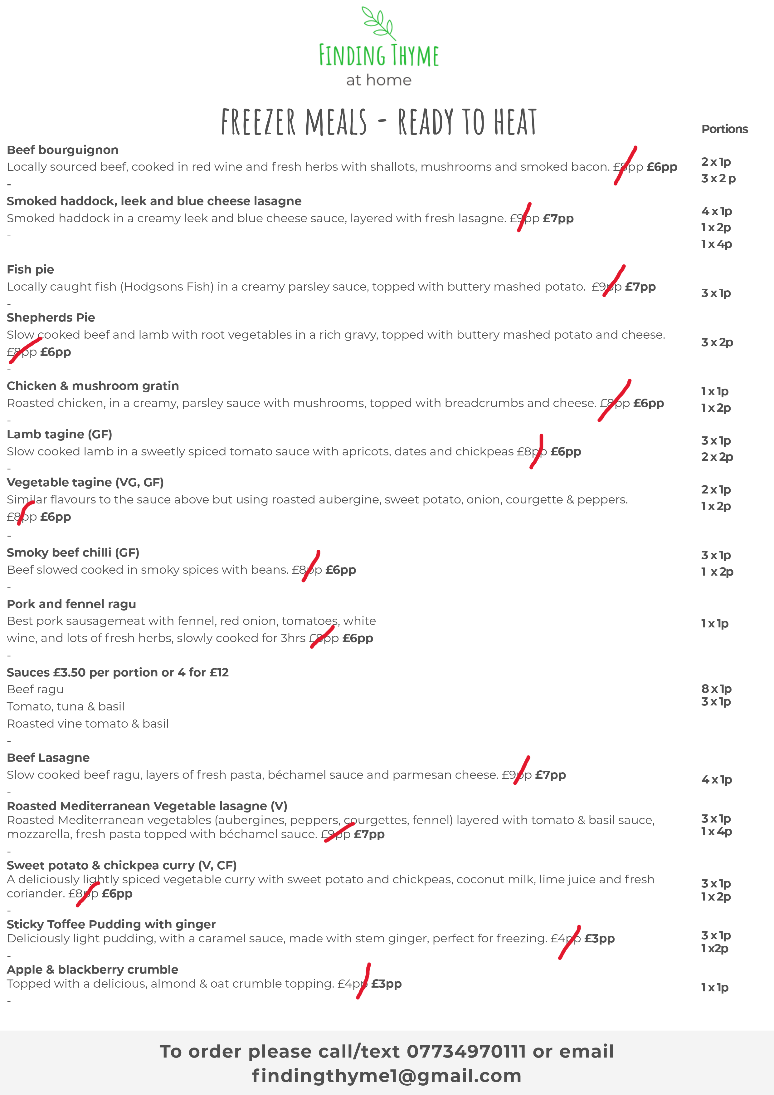 If you can’t see what you would like please look at our mains, puds & cakes menu below, minimum 8 portions of one dish if we are not cooking fresh that week.
